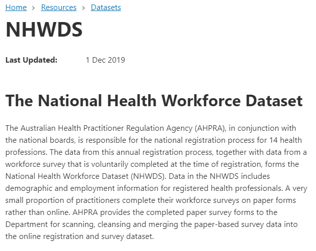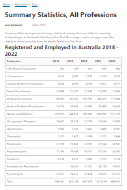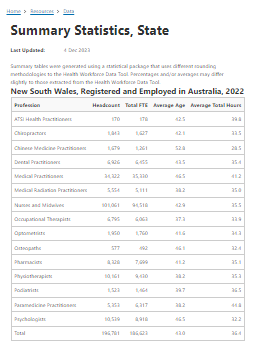 Summary Statistics for all registered professions, populated with statistics from the Health Workforce Data Tool using the National Health Workforce Dataset (NHWDS)