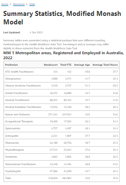 Summary Statistics for all registered professions by Modified Monash Model, populated with statistics from the Health Workforce Data Tool using the National Health Workforce Dataset (NHWDS)