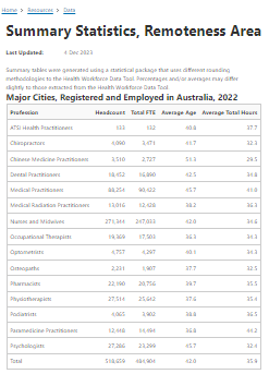 Summary Statistics for all registered professions by remoteness area, populated with statistics from the Health Workforce Data Tool using the National Health Workforce Dataset (NHWDS)